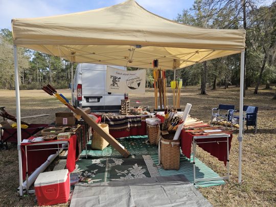 The hay bale target inside the park was moved to just outside the gates to county property and with the goodwill of the park’s neighboring property owner, the contest continued! Photo below: Thunderbird Atlatl’s set up at the Letchworth Love State Park.